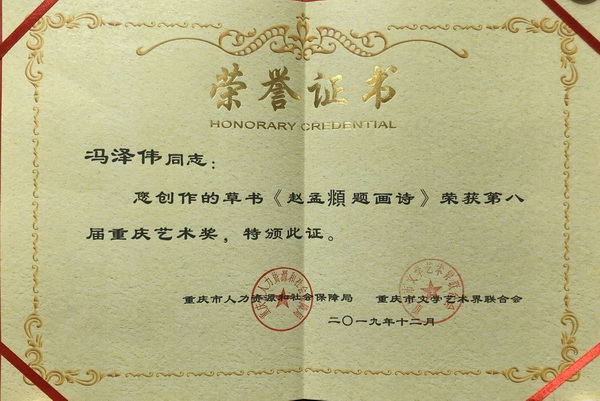近日,第八届重庆艺术奖评选活动圆满落幕,我校中国画与书法艺术学院2018级研究生冯泽伟同学创作的草书作品《赵孟頫题画诗》从众多参选作品中脱颖而出,成功获得第八届重庆艺术奖。