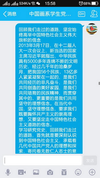 6月19日下午3点,中国画系学生党支部考虑到学生学习较忙、部分同学周末和课间均在实习等实际,创新党课形式,拓展学习途径,充分运用网络平台举行“两学一做”专题学习研讨,让党课成为党员喜欢的一种党内教育形式。