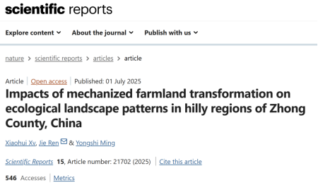 近日,国际期刊《Scientific Reports》(JCR一区,影响因子3.9)在线刊发我校建筑与环境艺术学院研究生团队成果——《宜机化改造对中国丘陵山区农田生态格局的影响——以重庆市忠县为例》(Impacts of mechanized farmland transformation on ecological landscape patterns in hilly regions of Zhong County, China)。论文由任洁副教授指导,我校2022级风景园林硕士研究生徐晓慧(第一作者)、明咏诗完成。文章紧扣国家农田整治与乡村景观数字化战略需求,通过量化分析,构建了宜机化改造对农田生态格局的影响机制,为可持续发展乡村农业产业提供了科学依据。此外,徐晓慧同学相关研究成果也曾发表于《Buildings》(JCR二区,影响因子3.1),并于国际风景园林师联合会(IFLA)世界大会上进行宣读。