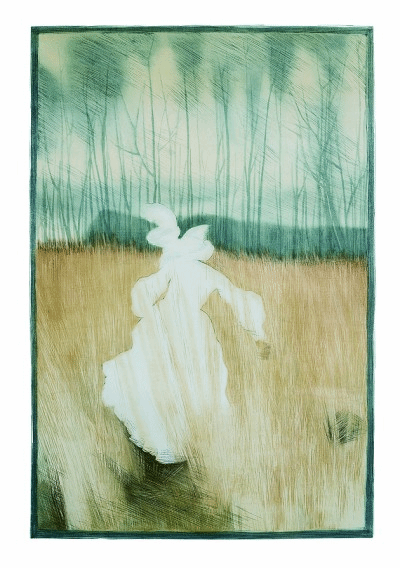 将水印木刻技艺运用于绘本创作,其一大亮点在于为画面带来丰富的质感变化。将水性颜料涂于刻制好的木板之上,再覆盖宣纸进行印制,是水印木刻的基本技术流程。虽然在木板上刻制的图案有明确而清晰的轮廓,但水、颜料与宣纸三者的“互动”却有着诸多不确定性,是极难把控的变量,同时也为画面带来千变万化的艺术效果。而要灵活掌握这种自然、随机的变化,使其契合绘本的叙事表现,则有赖于创作者对水印木刻技艺的深入理解与纯熟运用。