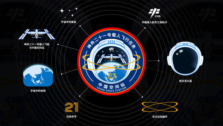 今年1月21日,中国载人航天工程办公室发布了神舟二十一号载人飞行任务标识。其整体以航天员头盔元素作为设计主体,传递出中国航天事业事在人为,探索永不止步的理念。标识设计的主要元素由航天员头盔、天文仪双圆环、地球、神舟飞船以及中国空间站组成。