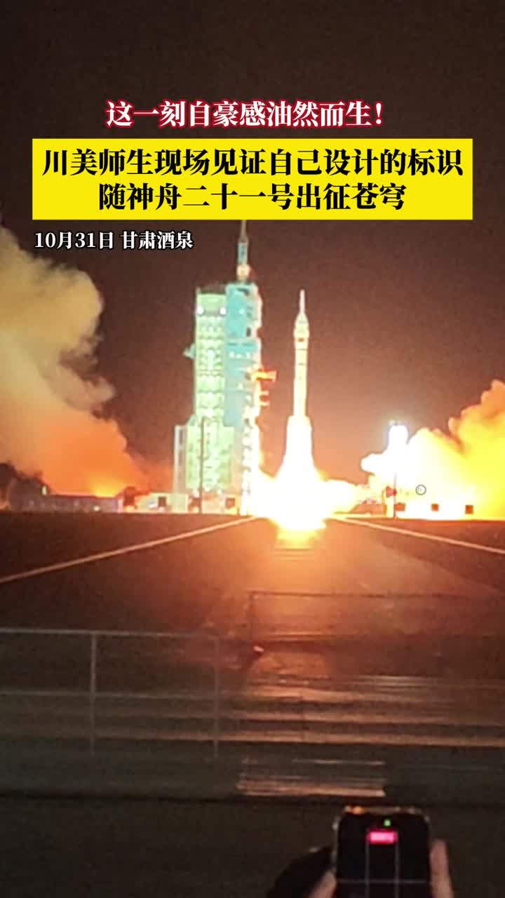 顾欣告诉记者,“发射的指令声响起后,火箭伴随着剧烈的轰鸣声腾空而起,现场也爆发出阵阵惊叹!由川美设计的神舟二十一号载人发射任务标识,终于伴随着三名航天员升上天空,我们期待这次航天任务圆满成功,英雄早日凯旋!”