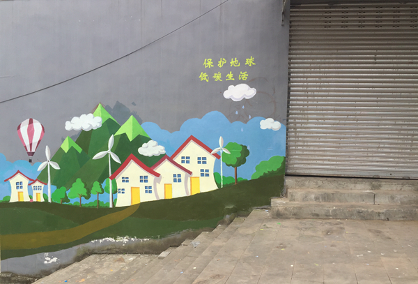 首先进行的是以环保为主题的墙绘工作。夏日炎炎,顶着烈日,冒着酷暑,忍着蚊虫,同学们仍认真地绘制墙面。大家积极讨论,合理分工,团结互助,发挥了优秀的团队合作精神,经过几天的辛苦努力,终于完成了环保主题墙绘绘制。