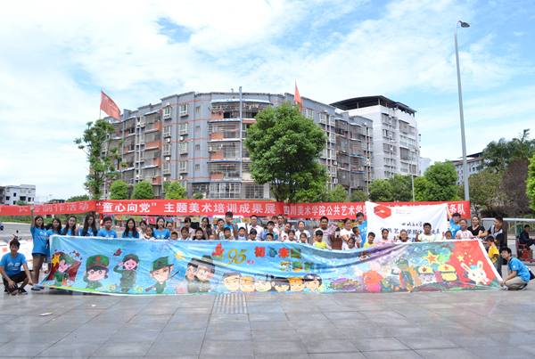 丁家镇地处璧山区南部,留守儿童众多。此次实践队为留守儿童派发了学习用品。在丁家镇的铜锣社区开展了为期五天的“童心向党”主题美术培训。在这次培训活动中,大学生们重视对孩子们思维发散的培养,引导孩子去大胆的想象,将小朋友带入一个丰富多姿、异彩纷呈的美丽世界,不断丰富小朋友的绘画经验,提高审美情趣。在教授小朋友绘画的同时,大学生们提高了自己的专业水平和实践经验,也丰富了小朋友的想象力,激发他们对绘画的兴趣。