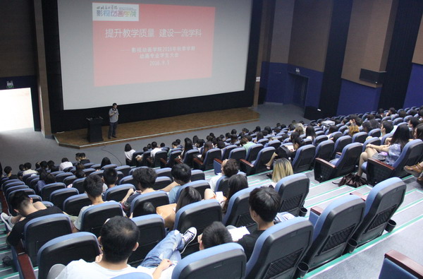 为响应国家建设一流大学和一流学科的号召,提升我院教学质量,加快培养拔尖创新人才,将思想政治教育与专业教育结合起来,影视动画学院于9月5日下午在学校小剧场召开全院动画专业学生大会。影视动画学院党总支书记柏在华、影视动画学院副院长周宗凯、动画专业教师王茜濡、钟崇瑶、布志国,辅导员老师万玉珊、唐巧玲,以及动画专业全体学生参加了会议。会议由王茜濡主持。为动画专业的同学传授经验,