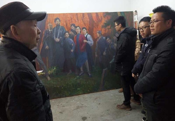 随后张教授提出学生党员应当在今后的创作中把对人的精神升华作为目标。对于如何成为优秀文艺工作者,提出了几点要求:一要掌握纯熟优秀的技艺;二要在生活中体会艺术的细微差别;三是绘画创作者要培养构图技巧和注重色彩搭配;四要积累广泛的文艺知识;五要热爱生活并富有同情心,关注人民;六要提高审美水平,多创作多鉴赏;而且特别要注意加强锻炼,只有健康的身体才能创作出更多优秀的作品。最后,所有的学生党员参观了张教授的工作室,以及正在创作的作品。