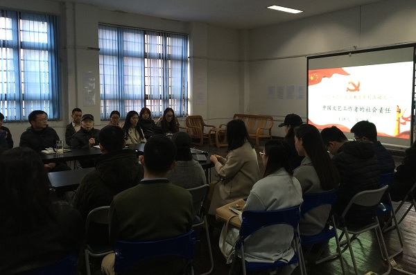 3月7日下午3点30分,公共艺术学院党总支和离退休处党总支在老校区红楼三楼党员活动室联合开展本学期第一次党员教育活动,邀请学院老党员油画系张方震教授向40多名学生党员做“中国文艺工作者的社会责任”为主题的报告。活动由公共艺术学院党总支副书记郭小兵主持。