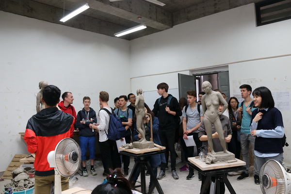 实验班学生引领德国友人参观了虎溪校园,途经断桥广场、设计学院、罗中立美术馆、虎溪公社等,最后来到雕塑系观摩了同学们的人体写生。德国交换生们兴致勃勃地欣赏了雕塑系同学在制作雕塑前探索思路用的草模,并且向同学们询问“制作一个雕塑作品需要多少时间?”,“你们能在哪些事物中获得灵感?”等等专业问题,双方同学针对艺术创作进行了深入友好的交流。