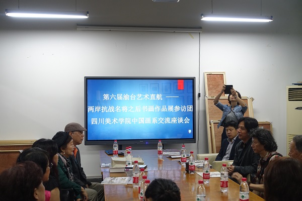 上午11时,中国画系会议室举行了第六届渝台艺术直航 ——两岸抗战名将之后书画作品展参访团-万象城平台中国画系交流座谈会,中国画系领导黄山、王士臣以及部分教师代表参加了座谈会。