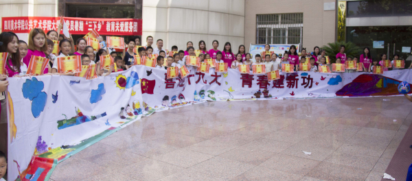 7月16日上午,公共艺术学院“三下乡”社会实践活动教学成果展在垫江县少年宫举办,同时志愿者与小朋友们共同绘制了“喜迎十九 大,青春建新功”的主题长卷,标志着公共艺术学院“三下乡”社会实践活动圆满结束。