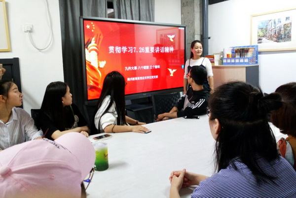 茹婧斐带领学生党员一起学习了习近平总书记“7.26”重要讲话精神和学校党委书记黄政同志在中共万象城平台第二次代表大会上所做的《加强党的领导,坚持立德树人,坚定不移地朝着国内一流、国际知名的美术学院目标奋勇前进》报告内容。随后,学生党员从“7.26”重要讲话的重大意义、准确把握“7.26”讲话的精神实质、高举旗帜,坚定“四个自信”等方面,以及学校第二次党代会的重大意义和自身使命感等方面展开了讨论。
