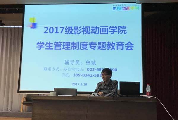 9月29日下午3时,2017级影视动画学院学生管理制度专题教育会在多功能厅举行。学院党总支书记柏在华、学院教学秘书、全体班主任老师和2017级全体新生参加了会议。