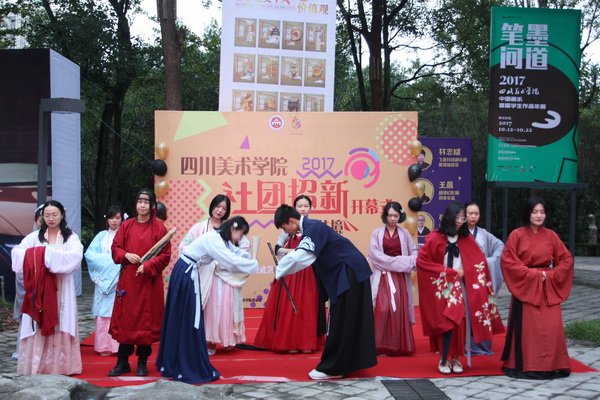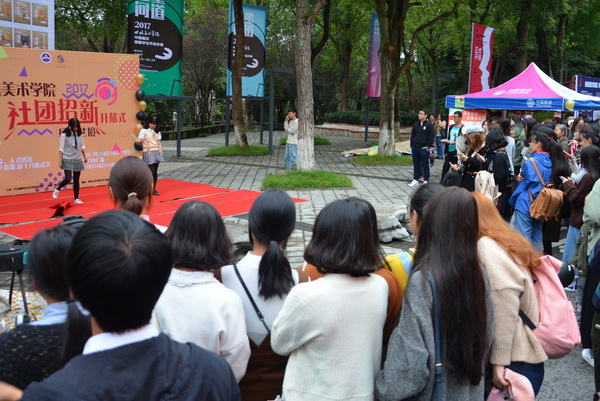为展示我校学生社团的风采,扩大学生社团的校园影响力,为学生社团的可持续发展注入新鲜血液,10月11日下午,由校团委主办、社团联合会承办的2017年万象城平台“团盈艺境”社团招新开幕式在学生食堂小广场举行,全面启动了为期三天的2017年学生社团招新活动。学校党委常委、副校长彭林权亲临活动现场,对学生社团的建设与发展提出了宝贵意见。