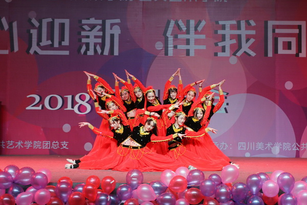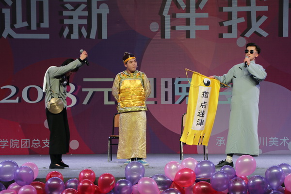 晚会首先播放了公共艺术学院党政领导对学院全体师生的新年祝福和寄语的暖场视频。随后,由2017级新生带来的舞蹈《BOOM!》拉开了晚会帷幕,调动起全场欢快热烈的氛围;《Prize tag》和《凉凉》等歌曲轮番上场,或摇滚激烈,或轻快悠扬;《花儿为什么这样红》《Crazy night》《中国妈妈》和《midnight boomba》等舞蹈美轮美奂,让观众沉醉其中;来自2014级学生的说唱组合用《Time》倾心演绎了自己对四年大学时光的感悟,对未来生活的憧憬以及对学弟学妹的真诚祝福;现场配音《川美的日子》在为现场观众带来视听盛宴的同时,也让观众感受到了川美学子的日常生活风貌;令人捧腹的小品表演《新时代》更是让观众乐不可支,幽默风趣的台词、滑稽搞笑的肢体动作引得观众们欢笑不断;晚会还设置了手机参与口令红包抽奖活动,晚会气氛高涨;最后,晚会在朝气蓬勃,青春激扬的2017级学生合唱《骄傲的少年》中落下帷幕。