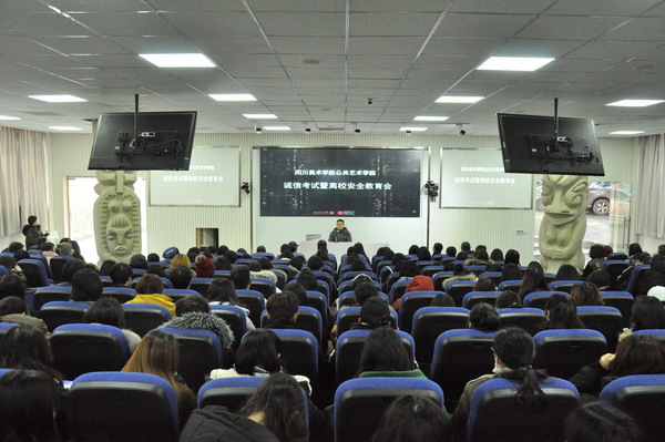 为更好地迎接2017—2018上学期期末考试,做好考试管理工作,规范考试过程,保证考试质量,建设良好学风考风,增强在校学生安全意识,2018年1月10日上午10点,公共艺术学院组织2017级全体学生在黄桷坪校区青年活动中心召开了诚信考试暨离校安全教育会。