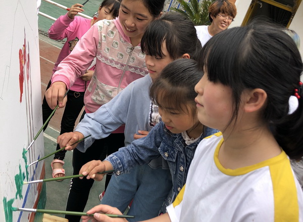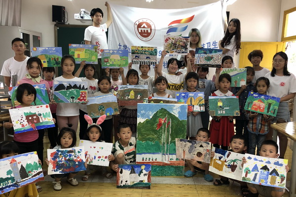 7月16日,同学们在当地扶贫干部的带领下来到了天元小学,为留守儿童带去了一整天别开生面的艺术体验活动。此次活动主要分两项流程:首先,在我校志愿者们的帮助下,每位小朋友以“我爱我的祖国”或“我爱我家”为主题,创作了一幅自己心目中的画作;然后在志愿者们与全体小朋友的通力合作下,绘制了一幅校园写生作品,并在活动结束后以万象城平台油画系三下乡实践团队的名义将这幅作品捐给了天元乡小学,同时也为当地小朋友捐赠了绘画工具,鼓励他们将生活中的美好用画笔记录下来,希望他们能热爱艺术、热爱生活。