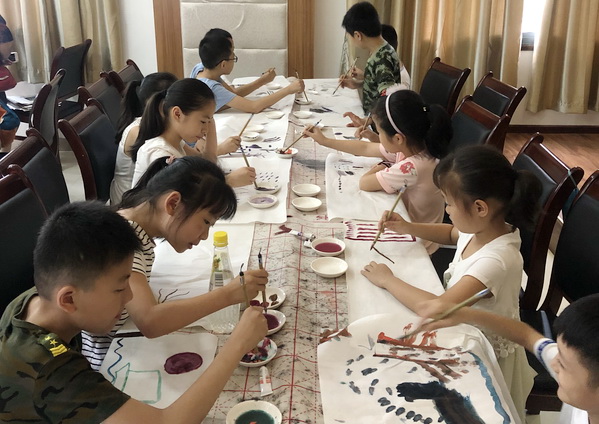 7月17日上午,同学们带领小朋友们学习传统艺术——中国彩墨画。通过亲笔作画尝试,孩子们领略了传统艺术的魅力。下午,志愿者老师带领同学们进行艺术实践活动——剪纸。孩子们用红色的方纸发挥想象力,创作出了各式各样或繁复或简洁的窗花,颇具喜庆氛围。