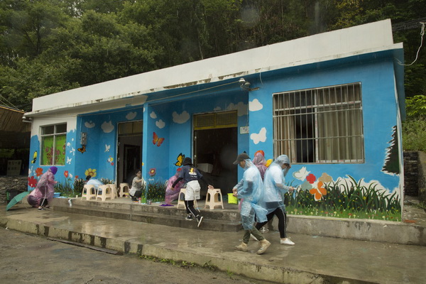7月14日至18日,实践团每日往返3公里山路,为村口小平房绘制艺术墙绘。在墙绘过程中,城口时有下雨,但队员们不顾风雨,在条件允许的情况下,坚持冒雨绘制墙绘,将联丰村优美的自然环境和特色动植物结合起来,希望将此处打造成为联丰村的特色“打卡胜地”,增添联丰村的吸引力。墙绘的小平房是政府为联丰村两位贫困户修建的房屋,其中一位住户是90多岁的老兵,一位是曾经思想比较被动,总是“等、靠、要”,但经过扶贫工作人员实实在在的工作,转变了思想,开始主动寻求自强方法的村民。实践团成员的到来给两位老人的生活带来了一些活力,他们对实践团成员的墙绘工作也提供了一些帮助,还夸赞墙绘画得非常漂亮。