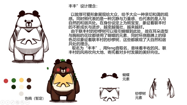联丰村生态环境非常良好,林间山上有很多珍贵的野生中药材和珍稀菌类植物,也有许多野生动物,尤其是有野生黑熊出没,因此,实践团队员们以联丰村野生黑熊、特色桫椤树等元素,设计了联丰村的动漫形象“丰丰熊”,借助动漫形象来增添联丰村的吸引力。