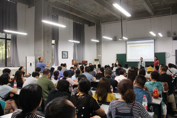 建环学院院长黄耘向新生及家长介绍了建环学院特色化人才培养模式、目标定位、专业布局、特色课程等,并具体介绍了建筑、风景园林的课程体系、课程资源、就业情况及近三年在全国各类重要赛事上的获奖情况。