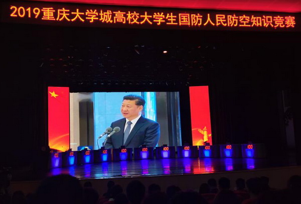 同时,在2019级军训新生中择优选出徐红(设计学院)、陈非非(造型艺术学院)、刘佩如(艺术教育学院)三名学生代表参加10月17日的现场知识竞赛。三位同学通过一个半月的刻苦学习,牢记国防人防相关知识点,在面对重庆大学、重庆师范大学、四川外国语大学等十多所高校代表的激烈竞争,毫不怯场、沉着应战,在比赛规定环节结束时与四川外国语大学并列第一。但在随后的加赛环节中,憾负四川外国语大学,最终获得第二名的优秀成绩。