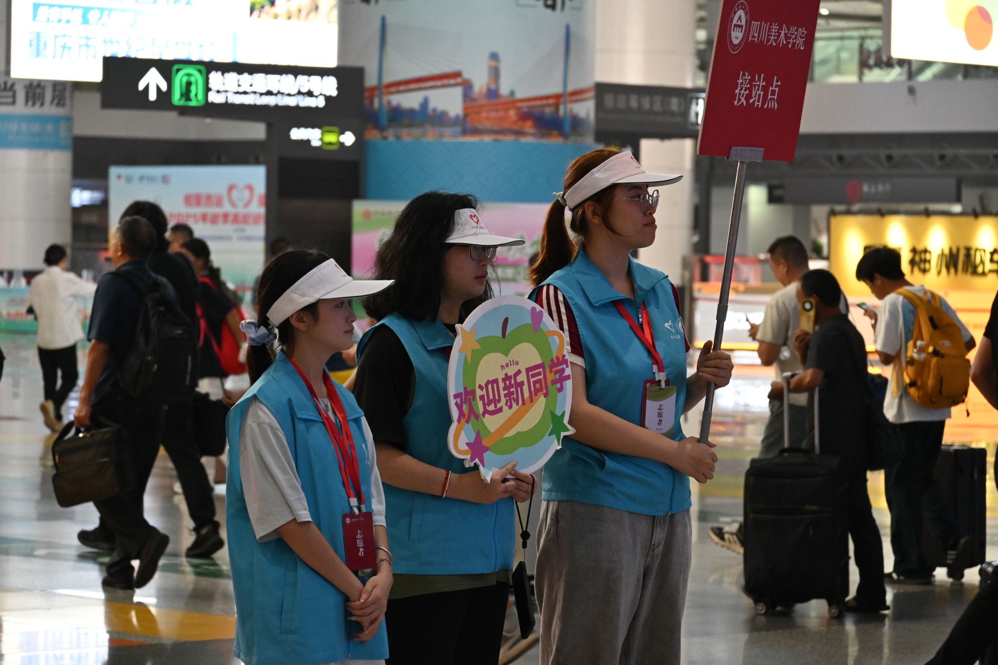 在重庆西站,志愿者手持引导牌,按照车次到站情况等候,热情迎接来自五湖四海的新生及家长。志愿者们分工明确,协助搬运行李,引导新生乘坐大巴,并耐心解答报到流程、校园生活等问题。志愿者们用细致周到的服务让新生们感受到家的温暖。