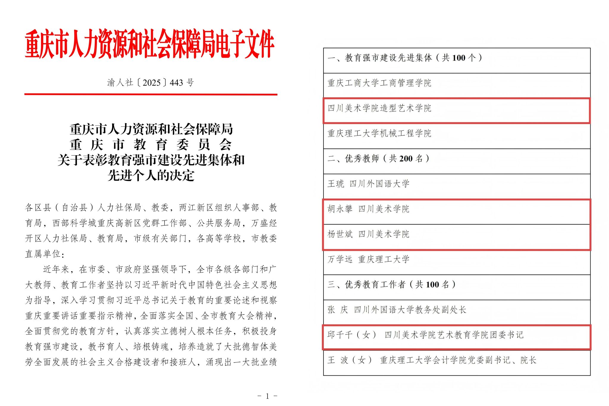 近日,重庆市人力资源和社会保障局、重庆市教育委员会联合发布《关于表彰教育强市建设先进集体和先进个人的决定》。我校造型艺术学院获评教育强市建设先进集体,设计学院胡永攀、造型艺术学院杨世斌2位同志获评优秀教师,艺术教育学院邱千千同志获评优秀教育工作者。