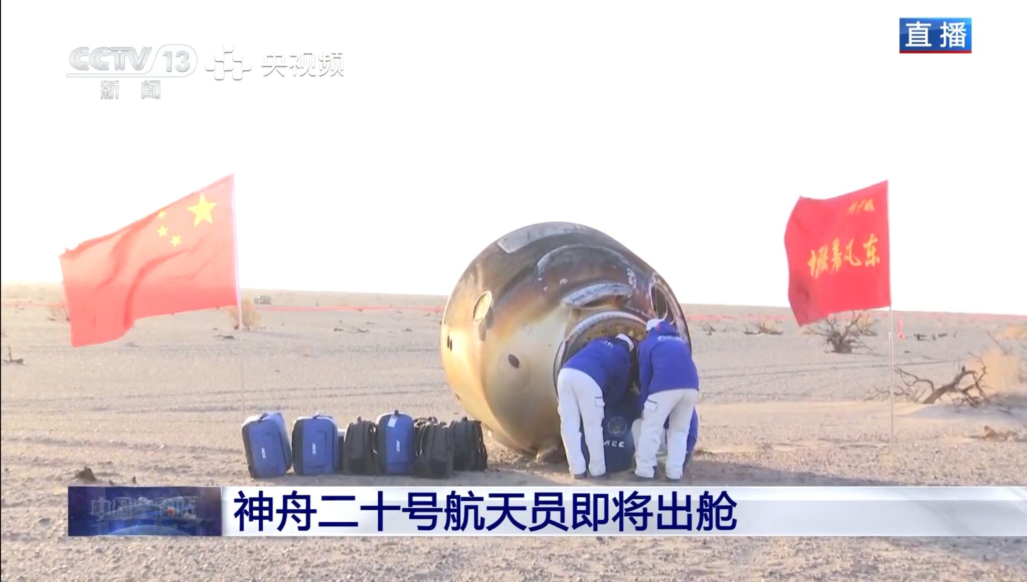 11月14日,神舟二十号航天员乘组搭乘神舟二十一号载人飞船返回舱在东风着陆场成功着陆。