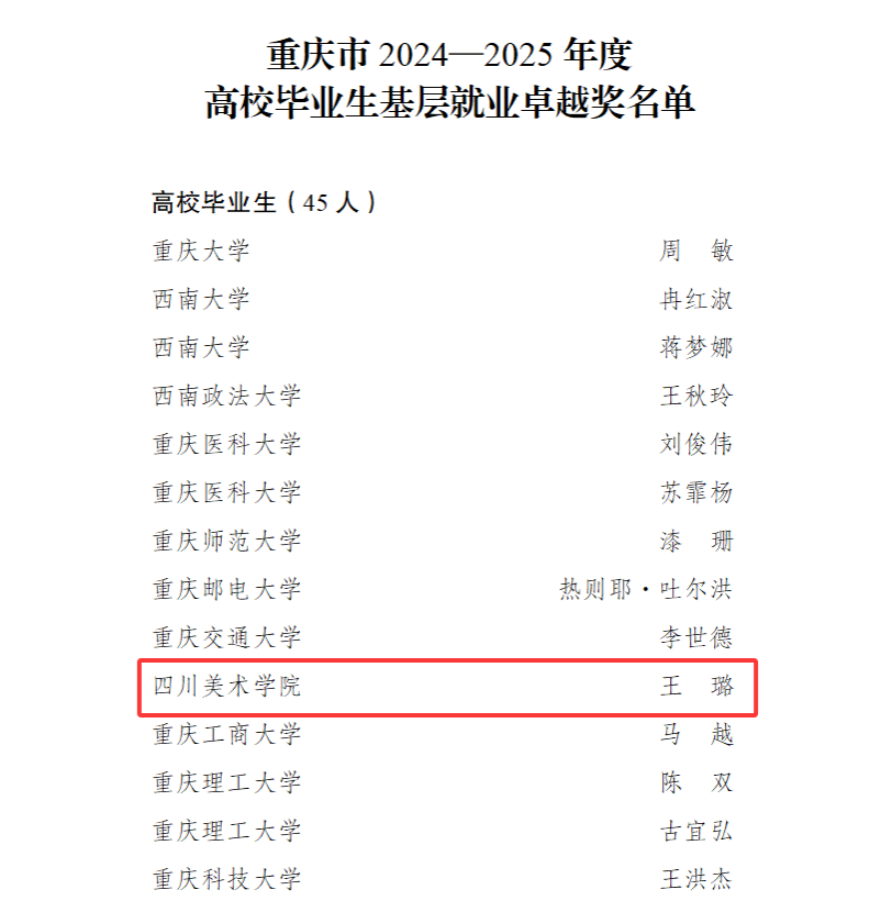 近日,《重庆市教育委员会关于2024—2025年度“高校毕业生基层就业卓越奖学(教)金”遴选结果的通报》发布,我校2021届设计学院毕业研究生王璐获评“重庆市2024—2025年度高校毕业生基层就业卓越奖”。