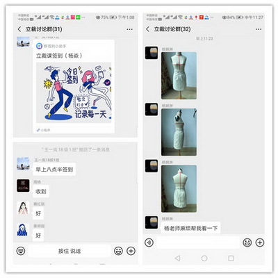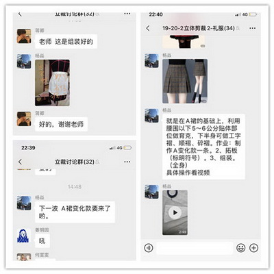 杨焱老师紧接登场,对于平时网络玩不顺畅的老教授而言,主动应战、迎难而上,提前几周便让同学们着手网络购买小号人台。基于服装设计《立体裁剪》授课的重实践、强互动的教学特点,为了让学生们通过网络能够真切的学好,杨老师提前在家里做足了功课,把课程中所有的案例实际操作示范全部录制成3-5分钟的小视频,一段段发放到课程群中,同学们按照视频步骤一步步的完成作业,再发放到讨论群中。在热烈的课堂气氛中,一轮轮学习、一步步修改、一个个讨论。