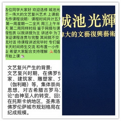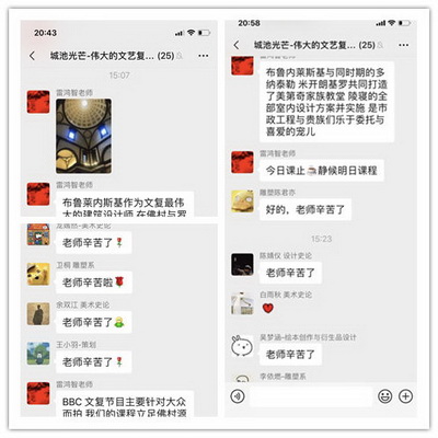 作为第一批线上授课的教师之一雷鸿智教授,所讲授的是全校通选课《城市之光——伟大的文艺复兴艺术史》。上课前三天便建立了班级微信教学群和学习通教学讨论平台,其课程立足佛村源发地,专业性讲述引得了同学们的浓厚兴趣。开学第一天授课顺利进行,雷老师的文艺复兴艺术史课程教授,给抗疫期间的同学们带来了一股春天的“文艺”之风。学生们表示想给主播老师刷个火箭,雷教授回应:不要火箭要作业。