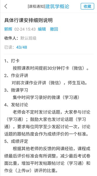 授课后,党支部对各个老师和班委反馈过来的课堂情况,结合授课过程进行了全面总结,并及时将经验和存在的问题同其他授课老师和学生进行分享。如:郭辉老师的课《建筑学概论》主要利用“学习通”微课视频教学,为增加学习互动效果,将原计划的最终大作业调整分解为随堂作业或课后小作业,增加与学生的沟通次数,保证教学进度与教学质量。