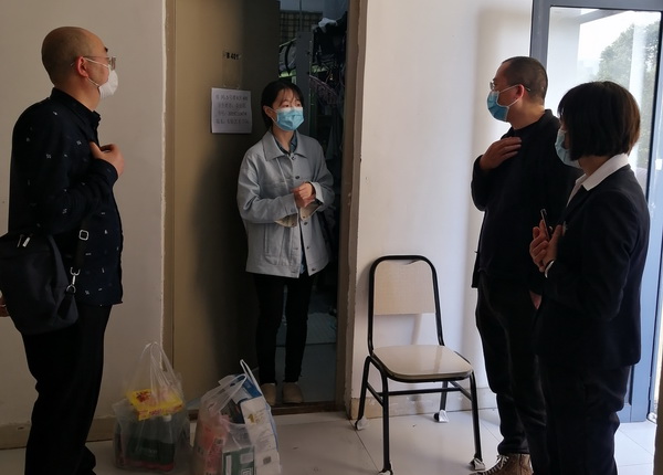 下午4时许,实验艺术学院党总支书记郑川、院长李川、辅导员一同到返校学生指定入住寝室看望慰问了湖北返校学生,给学生送去了牛奶、矿泉水、蛋糕、纸巾等生活用品,并与学生亲切交谈,询问了学生家庭情况、疫情期间的生活状况,了解学生在生活上、学习上的需求,还与楼层管理员就学生在健康管理期间相关问题进行了交流。