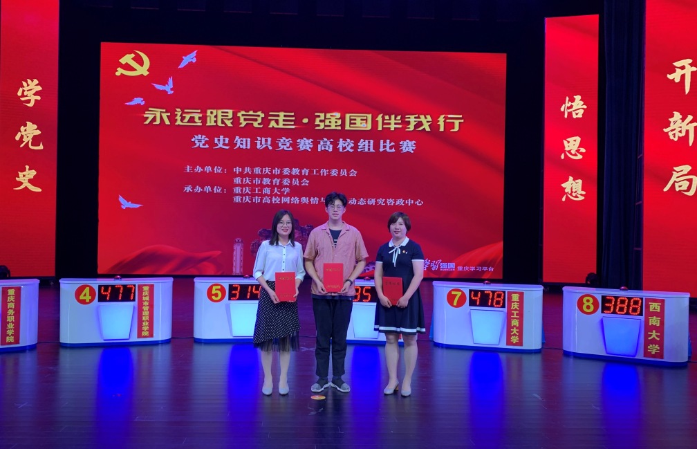 6月10日,由市委教育工委、市教委主办的“永远跟党走-强国伴我行”党史知识竞赛高校组比赛在重庆工商大学举行。来自全市高校的56支代表队展开了一场精彩的智慧比拼,我校党委宣传部也精心组织师生代表队参赛。
