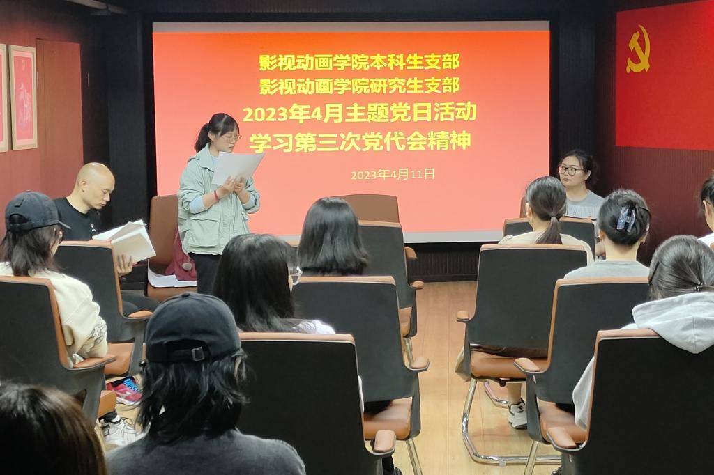 根据川美委〔2023〕43号《关于认真学习宣传贯彻学校第三次党代会精神的通知》文件精神,为了把全院学生党员和广大师生的思想统一到大会的精神上来,4月11日下午,影视动画学院本科生和研究生党支部组织召开专题党日活动,学习贯彻学校第三次党代会精神,会议由影视动画学院本科生党支部书记张剑同志主持,全体学生党员参加。