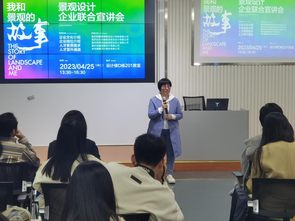 为切实做好学生就业指导工作,充分发挥学院在学生就业工作中的作用,赋能低年级学生进行职业探索、就业思考,帮助高年级学生了解专业发展、行业前景,不断提高人才培养质量,助推毕业生更高质量更加充分就业,建筑与环境艺术学院积极联系用人单位来校召开宣讲招聘。4月26日下午,在设计楼D栋201教室,举办了景观设计企业联合宣讲招聘会,共有5家企业来校进行宣讲招聘。