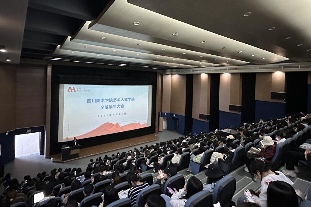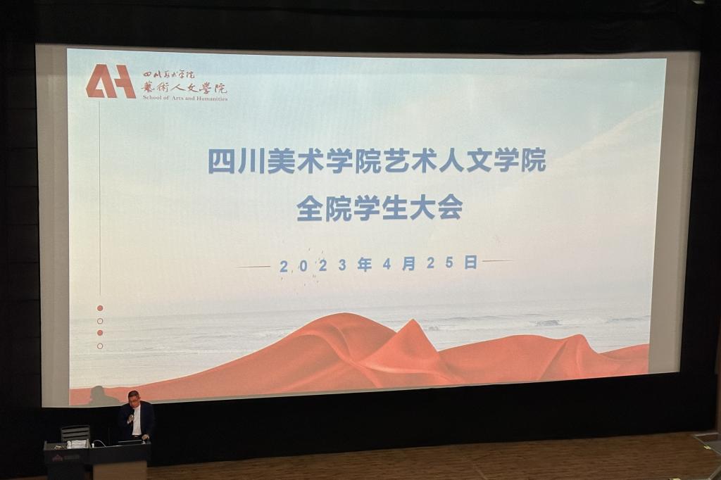 4月25日,艺术人文学院在小剧场召开学院本科生和研究生参加的全院学生会议,学院党总支书记、副院长杨茂森做了题为《树信心,强自立,做无愧青春年华的大学生》的报告,与同学们交心、共情,希望同学们有收获、有事成、有快乐、有无愧青春年华的大学生活,有意义地度过人生最美好阶段。
