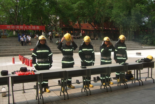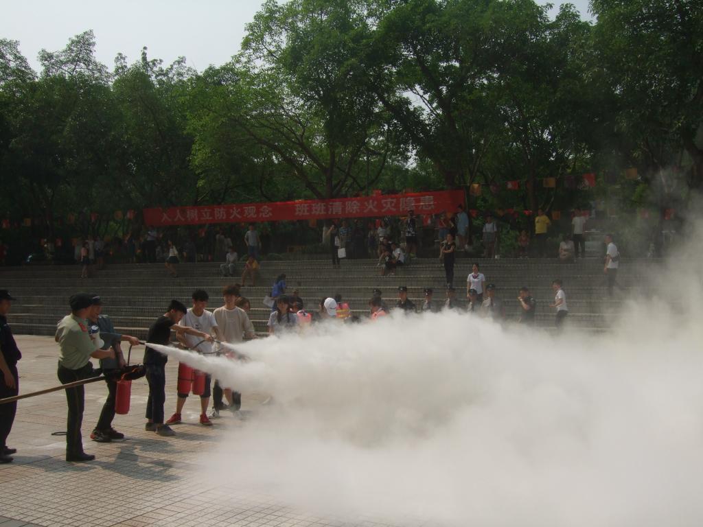 随后,九龙坡区消防支队张参谋讲解了报警流程、自救互救、逃生知识和灭火器的使用方法,使学生开阔眼界,增长了消防知识;公共艺术学院教职工、学生和物业管理人员进行灭火器实际操作演练;最后微型消防站队员进行了链接水带枪头喷水灭火演练。
