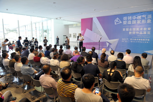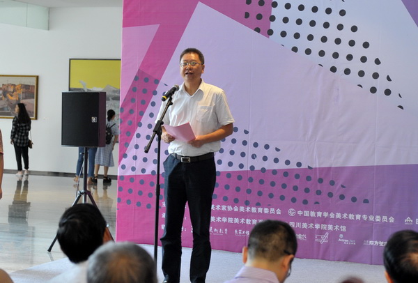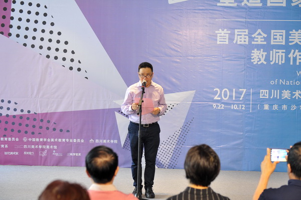 中国教育学会常务副会长刘堂江在致辞中讲到,此次展览旨在贯彻落实国务院办公厅《关于全国全面加强和改进学校美育工作的意见》的文件精神,进一步深化我国当前的美术教育改革,展示中国美术教育事业所取得的成就,繁荣美术创作,推出美术精品。展览涵盖我国基础教育和高等专业美术教育两大板块,参展人数多,参展作品质量高,开创性地展现了我国美术教育事业近年来所取得的辉煌的成就以及丰硕成果。中国美术家协会美术教育委员会副主任余丁在致辞中提出,当前世界格局变化,以及中国崛起带来的民族文化复兴,构建了文化艺术发展的新机遇,希望美术教师坚持创作,拓展艺术创新的视野,积极总结和梳理美术教育的经验,不断开拓美术教育新篇章。 重庆市委教育工委委员、专职督学邓清泉在发言中指出,强教必须强师,优秀的教师队伍是教育事业持续健康发展的根本保障。首届全国美术教育教师作品展览是全国美术教育从业者创作、研究和学术高水准的体现,为市民和教师提供了一次学习和借鉴的难得机会,更为深化美术教育综合改革提供更多案例和经验。