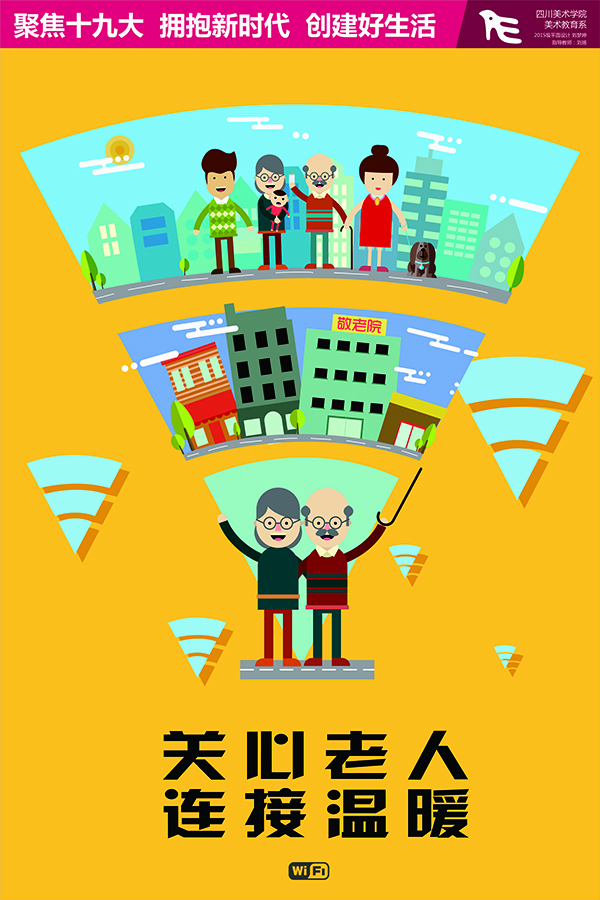 “人民对美好生活的向往,就是党的奋斗目标。”党的十九大报告提出,要坚持在发展中保障和改善民生。美术教育系师生围绕“幼有所育、学有所教、劳有所得、病有所医、住有所居、弱有所扶”等民生内容,创作了系列主题招贴。刘洋等老师从对十九大精神的解读,到内容主题的确立,到设计语言的选择,到画面内容的构成,对同学们进行了悉心的指导,共创作出系列作品50余幅。