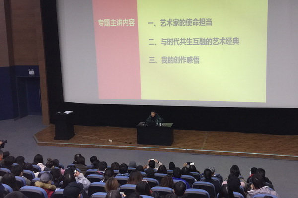 12月25日晚,学校党委副书记、校长庞茂琨教授在小剧场给学生上了一堂立人润心、催生出彩的专题思想政治理论课。他从艺术家的使命担当、与时代共生互融的艺术经典以及本人的创作感悟三方面,鞭辟入里地对主题艺术创作进行了讲述。