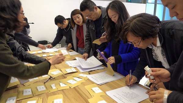 阅卷组打分后,立即离开。工作人员将已评分的试卷再次铺开,由专家复议组进行终审复议。