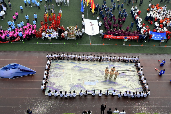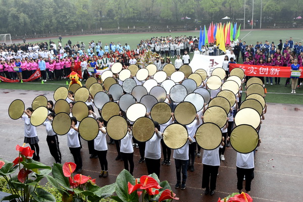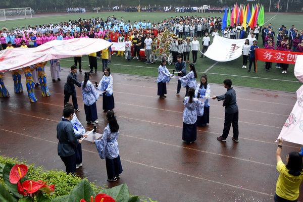 伴随欢快激昂的乐曲声,在学校校旗方队、彩旗方队的引领下,来自全校12个院系和机关两个总支的14支方队以饱满的精神状态,昂首阔步、意气风发地依序入场。各方队带来的独具专业特色的创意节目表演,赢得现场师生的阵阵掌声和欢呼声。