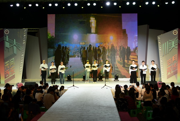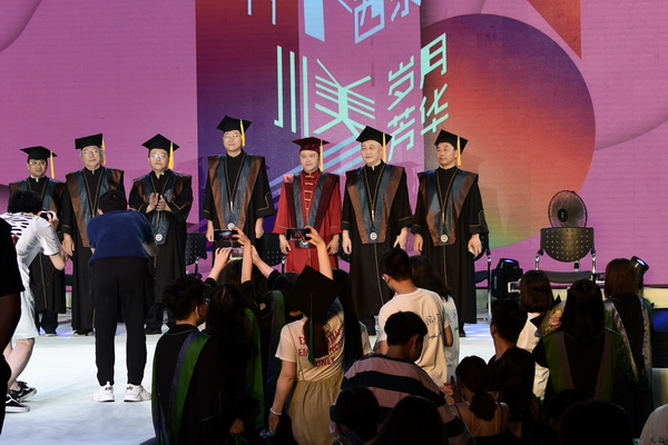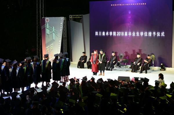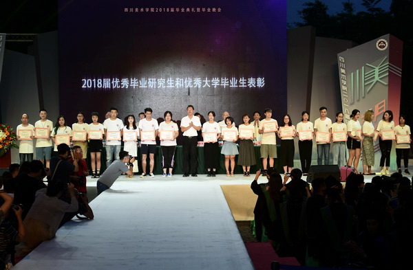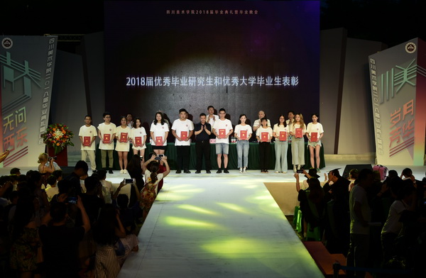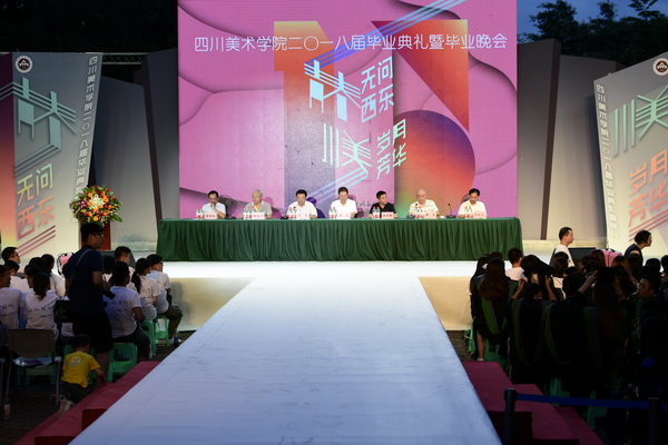 授位仪式后,“青春无问西东,川美岁月芳华”毕业晚会正式开始。艺术是传承,艺术是坚守,大学生艺术团带来的舞台剧《毕业歌》,生动展现川美人77年艺术的传承与坚守;轻抚书本,叩问心灵,综合舞部现代舞《我们结课了》满载知识星辉,尽展新时代青年豪气;“长亭外,古道边;天之涯,地之角”音乐部歌曲《岁月》将晚会惜别之情推向高潮。今宵诉别离,难忘恩师情,学工系统老师们的朗诵《骊歌初动》,引起现场全体师生共鸣。最后,设计艺术学院带来《介入·毕业服装秀》,将时尚设计介入传统文化、介入科技创新,体现西部设计的地域性、开放性、多元性,倾力寻求未来中国设计的可能性。艺路相逢,三生有幸;以梦为马,提笔年华,整个晚会在热烈的掌声与浓浓的温情中圆满结束。