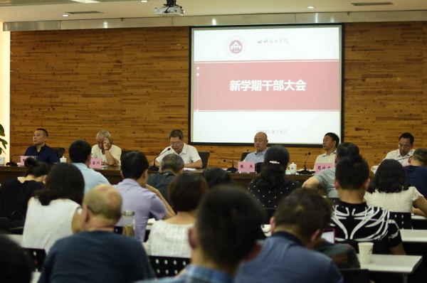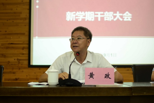 9月1日上午,学校召开新学期干部大会,简要总结暑期工作情况,部署新学期工作重点。会议由副校长张杰主持,在家校领导黄政、侯宝川、苟欣文、焦兴涛、彭林权出席,全体科级以上领导干部、二级教授及民主党派基层组织负责人、市政协委员、市人大代表、各党支部书记参会。