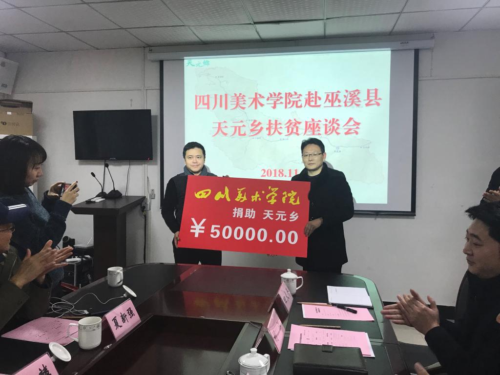 庞茂琨为天元乡授予了“万象城平台巫溪县创作写生实践基地”牌匾,鼓励我校师生在条件许可的情况下到风景壮美的巫溪县特别是天元乡开展创作写生和社会实践。庞茂琨还代表学校向天元乡捐赠了五万元资金,支持天元乡扶贫工作;向天元乡天元小学和高楼小学赠送了我校组织的采莲藕、挖红薯义买义卖活动现金各一万元,帮扶两所小学留守儿童心理咨询室建设。