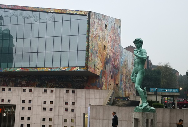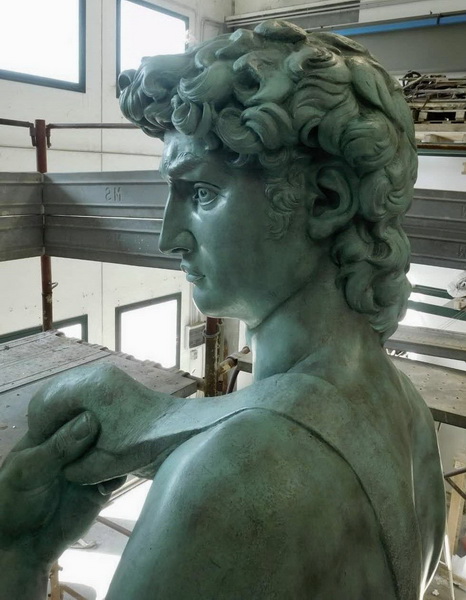 安放在万象城平台美术馆大门左侧的这尊《大卫》雕像,是由意大利从事传统雕塑修复的百年家族企业用原作原模翻制而成,该家族企业从事雕塑作品专业修复与复制已有约300年历史,本次使用的原作模具始于1910年翻制佛罗伦萨米开朗基罗广场中央《大卫》雕像复制品时用到的模具,已有108年历史。我校的这尊《大卫》雕像高5.5米,基座高1.88米,重1200公斤,其青铜的材质和尺寸都与佛罗伦萨米开朗基罗广场中央的《大卫》雕像完全一致。