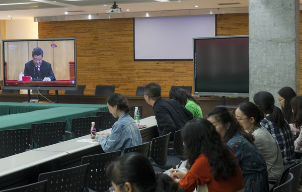 按照学校党委统一部署,学校领导和机关全体干部在行政楼第五会议室集中收看大会盛况,各教学单位分别组织本单位师生收听收看了大会直播。一些来不及参加集中收看的青年大学生,利用各种条件,通过网络、手机软件等渠道观看了大会实况。