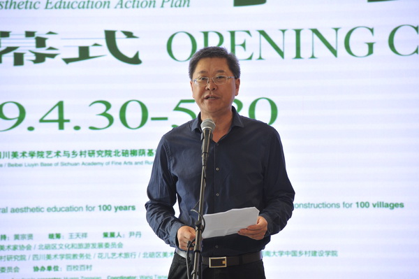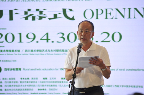 艺术与乡村研究院副院长、教务处处长王天祥教授作为展览主持人讲到创办此次展览的缘由:北碚是上个世纪中国乡村建设的发源地,也是中国腹地乡村振兴的新战场,身为北碚人,十分希望可以为家乡的美好贡献自己的一份力量,也十分有幸可以参与北碚区东升村美丽乡村的申报与创建工作。 北碚区柳荫镇党委书记杨华先生介绍了以文化振兴带动乡村振兴的构想与行动。