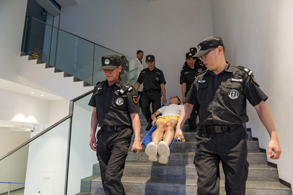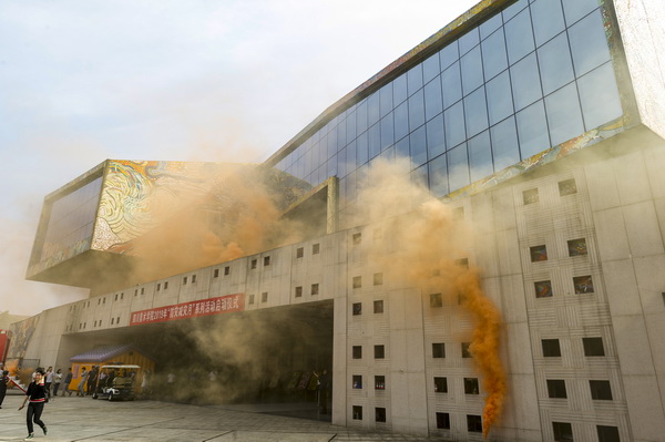 模拟美术馆火灾事故的应急疏散演练随后举行。现场师生在大学城消防中队、保卫处工作人员的引导下,在几分钟之内有序地从美术馆内疏散到了室外场地,既定预案顺利完成。